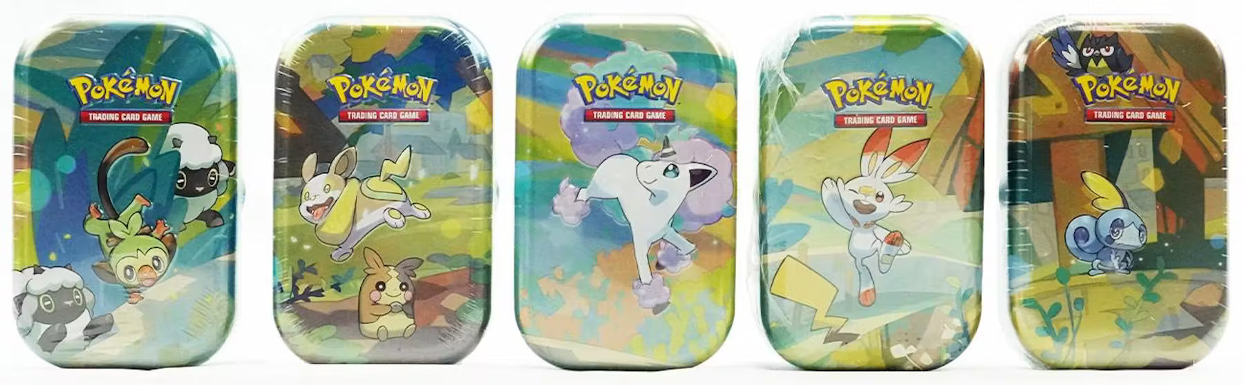 Expand your collection with this Pokemon Trading Card Game: Galar Pals Mini Tin, perfectly sized for taking your favorite cards on the go! This fantastic tin is easy to open and features Grookey and Wooloo in one of five fun Pokemon illustrations-and all five form a single image when you line them up!